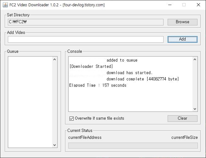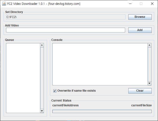 FC2 영상 수집기 입니다. FC2는 비디오 다운로더가 없길래 제가 쓰려고 만들었습니다. Browse 버튼으로 다운받을 폴더를 선택해 줄 수 있고 영상 주소 써넣고 Add 누르면 대기열에 들어갑니다. 콘솔